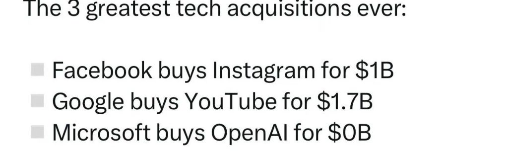 有人总结了互联网历史上最成功的三次收购,分别是Facebook收购instagram,谷歌收购Youtube,还有微软零元购了OpenAI。