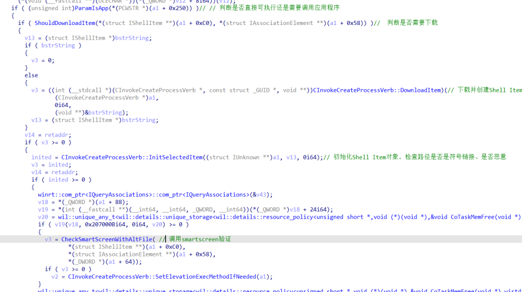 下载后调用CInvokeCreateProcessVerb::InitSelectedItem函数对shell item对象进行了一系列的初始化,并且检查文件路径是否恶意。