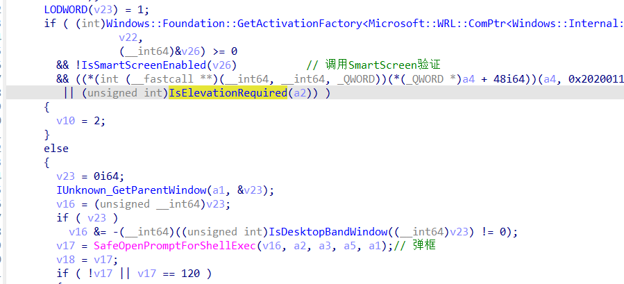 CheckSmartScreenWithAltFile中通过IsSmartScreenEnabled实现com调用到smartscreen.exe进行合法验证,如果验证失败,则调用SafeOpenPromptForShellExec弹框警告。