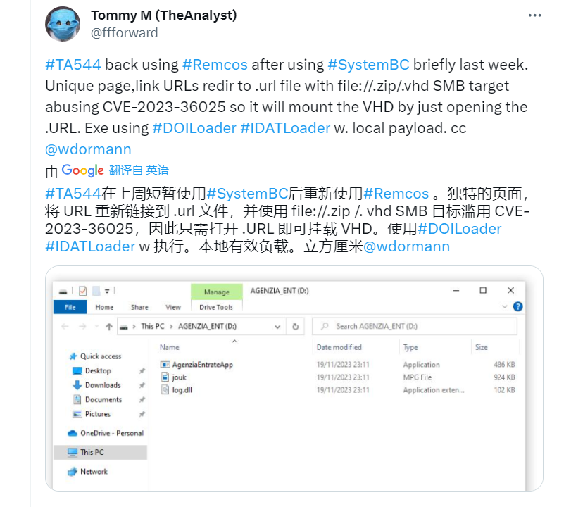 CVE-2023-36025是微软于11月补丁日发布的安全更新中修复Windows SmartScreen安全功能绕过漏洞。攻击者可以通过诱导用户单击特制的URL来利用该漏洞,对目标系统进行攻击。成功利用该漏洞的攻击者能够绕过Windows Defender SmartScreen检查及其相关提示。该漏洞的攻击复杂性较低,可创建并诱导用户点击恶意设计的 Internet 快捷方式文件 (.URL) 或指向此类文件的超链接来利用该漏洞,无需特殊权限即可通过互联网进行利用。